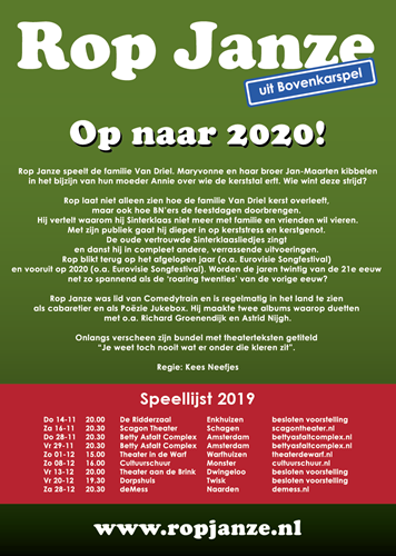 Vanaf 14 november 2019, twee dagen voor de landelijke intocht van Sinterklaas, speelt Rop "Op naar 2020!" Hierin viert hij Kerst, Sinterklaas én Oud & Nieuw op één avond, dan ben je er als publiek in één klap van af! Klik hier voor de speellijst.